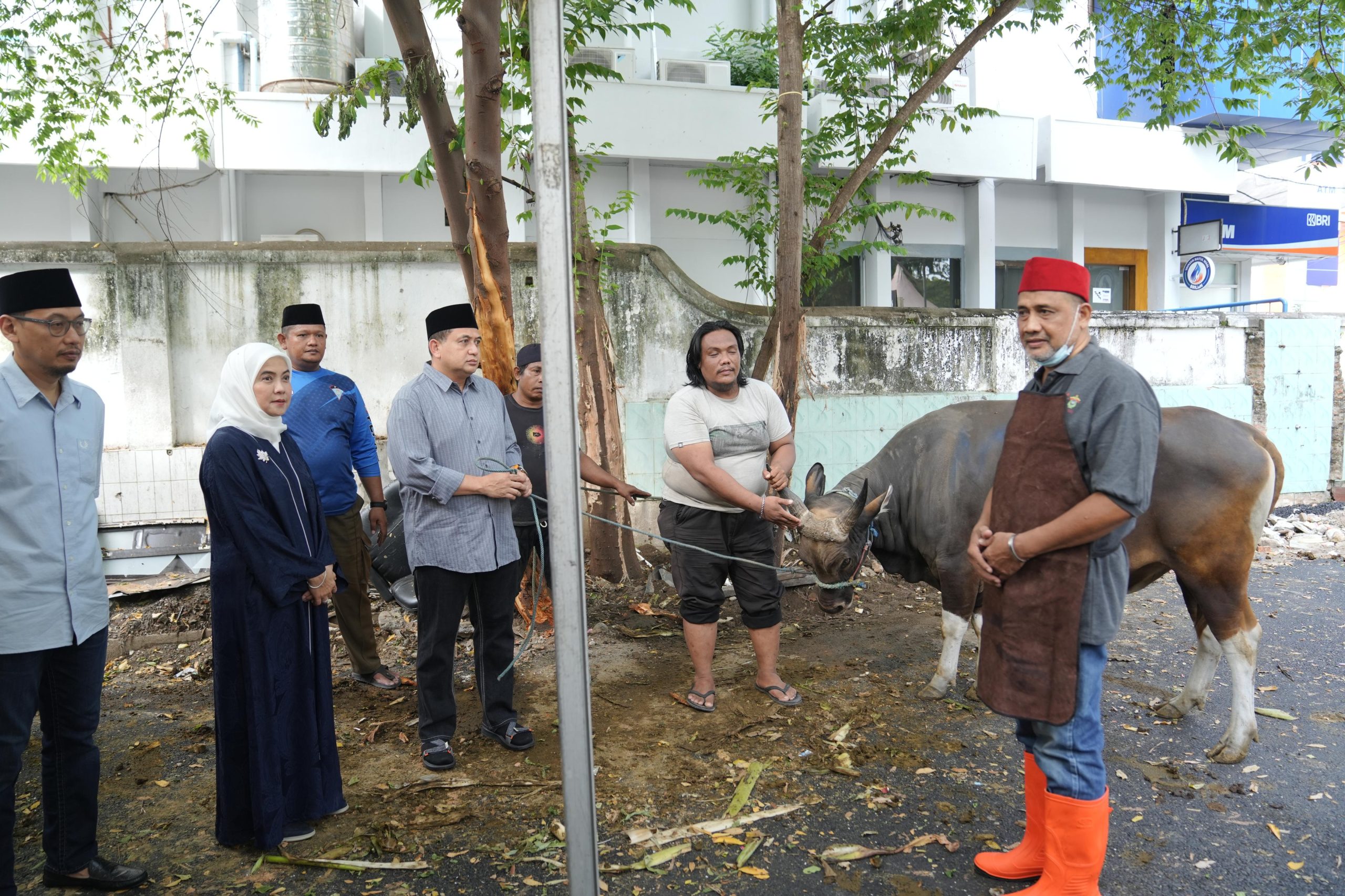 Wali Kota Makassar Munafri Arifuddin bersama Wakil Wali Kota Makassar Aliyah Mustika Ilham (Appi-Aliyah) menyaksikan langsung proses penyembelihan di pelataran Balai Kota Makassar, Sabtu (7/6/2025).