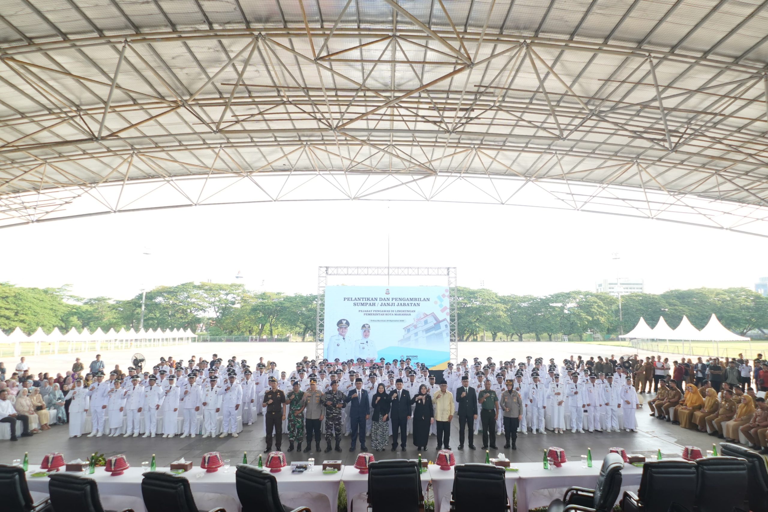 Prosesi pelantikan dan pengambilan sumpah/janji jabatan berlangsung di Tribun Lapangan Karebosi, Senin (29/09/2025), disaksikan jajaran Forkopimda dan pejabat lingkup Pemkot Makassar.