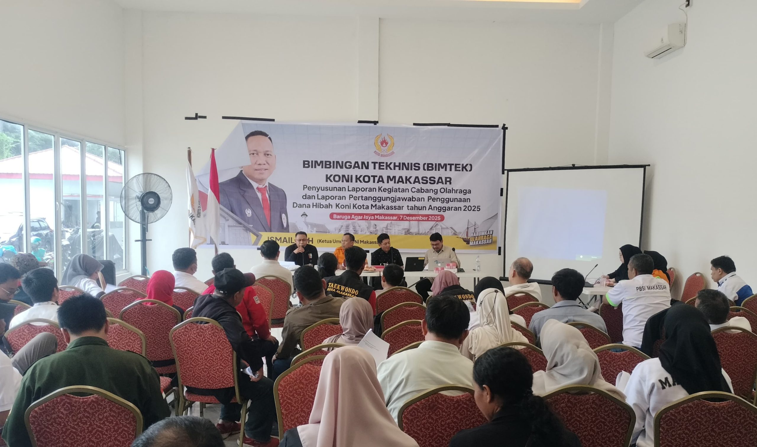 SudutMakassar.id, MAKASSAR -KONI Kota Makassar melaksanakan Bimbingan Teknis (Bimtek) Penyusunan Laporan Kegiatan Cabang Olahraga dan Laporan Pertanggungjawaban Penggunaan Dana Hibah KONI Kota Makassar Tahun Anggaran 2025. Kegiatan ini berlangsung di Baruga Agar Jaya KONI Kota Makassar, Minggu, 7 Desember 2025.