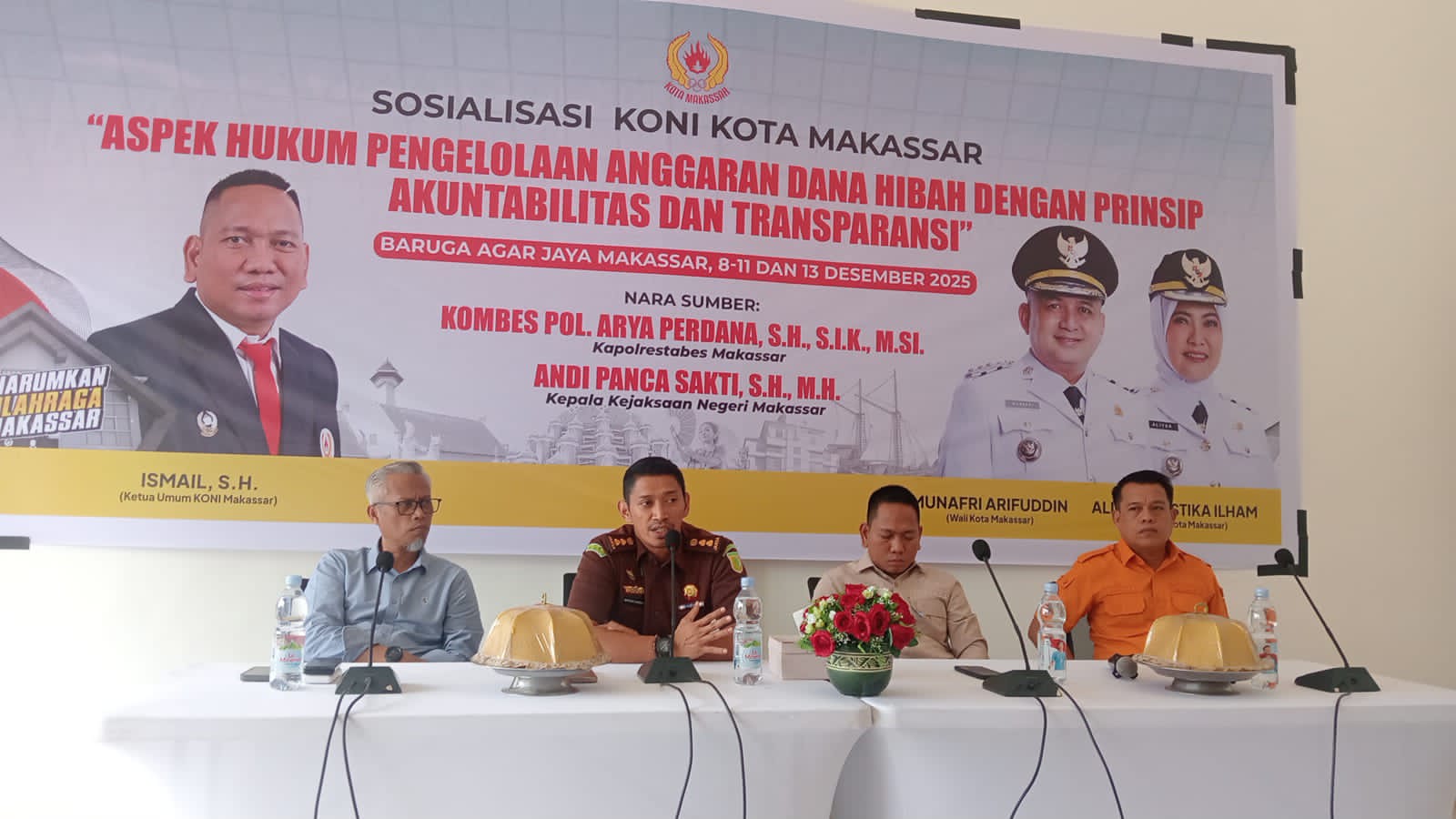 SudutMakassar.id, MAKASSAR – KONI Kota Makassar menyelenggarakan Sosialisasi Aspek Hukum Pengelolaan Anggaran Dana Hibah dengan Prinsip Akuntabilitas dan Transparansi, Senin 8 Desember 2025 di Baruga Agar Jaya KONI Kota Makassar. Kegiatan ini dibuka oleh Ketua Umum KONI Kota Makassar, Ismail, didampingi Sekretaris Umum KONI Makassar Iqbal Djalil.
