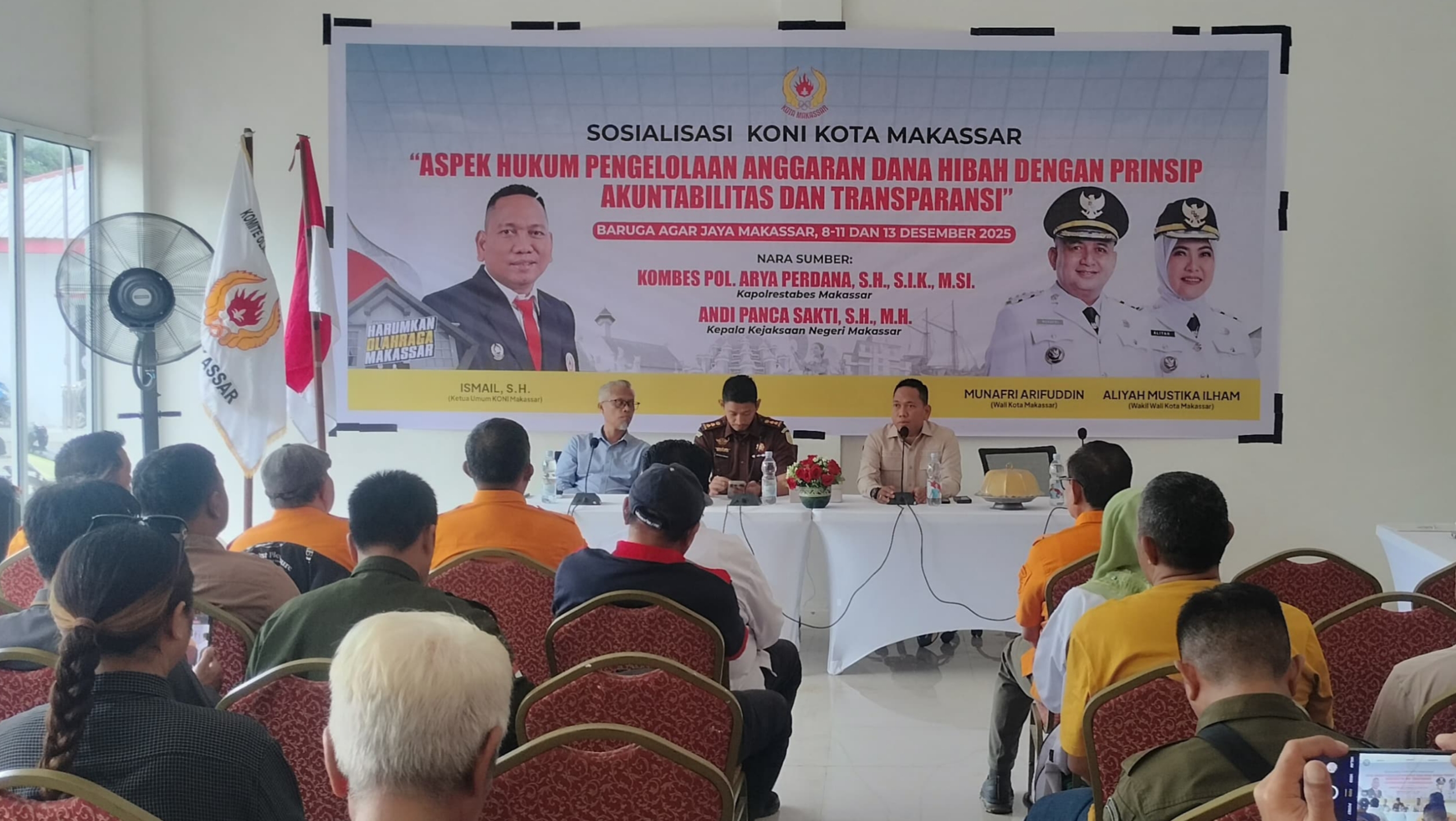 SudutMakassar.id, MAKASSAR – KONI Kota Makassar menyelenggarakan Sosialisasi Aspek Hukum Pengelolaan Anggaran Dana Hibah dengan Prinsip Akuntabilitas dan Transparansi, Senin 8 Desember 2025 di Baruga Agar Jaya KONI Kota Makassar. Kegiatan ini dibuka oleh Ketua Umum KONI Kota Makassar, Ismail, didampingi Sekretaris Umum KONI Makassar Iqbal Djalil.