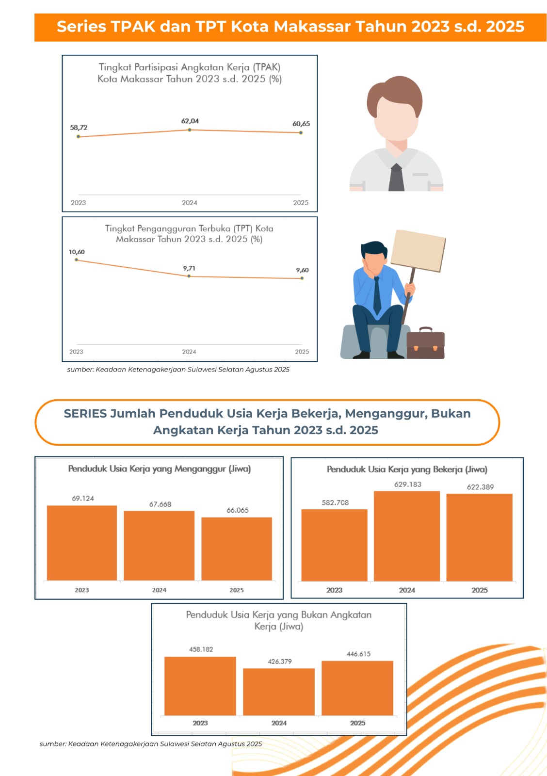 Sementara itu, tingkat pengangguran mengalami penurunan dari 9,71 persen pada tahun 2024 menjadi 9,60 persen pada tahun 2025. Penurunan ini merupakan hasil dari perluasan kesempatan kerja, penguatan sektor produktif, serta tumbuhnya aktivitas usaha yang semakin dinamis di Kota Makassar.